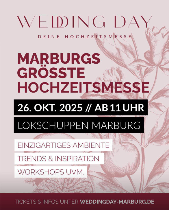 Am 26.10.2025 bin ich auf der Hochzeitsmesse in Marburg " Wedding Day". Ihr seid herzlich eingeladen, um mich persönlich und die andere Dienstleiterinnen und Dienstleister kennenzulernen.
